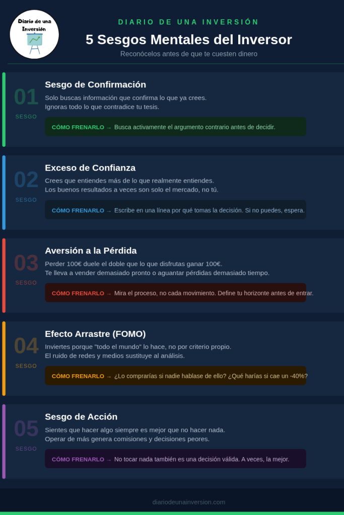 Si se detiene diez minutos y pasa esa decisión por el filtro de estos cinco sesgos mentales del inversor, puede darse cuenta de que no está actuando por criterio sino por ruido, miedo o prisa. Y ese simple reconocimiento ya mejora mucho la calidad de su decisión, aunque ese día no cambie nada en su cartera.